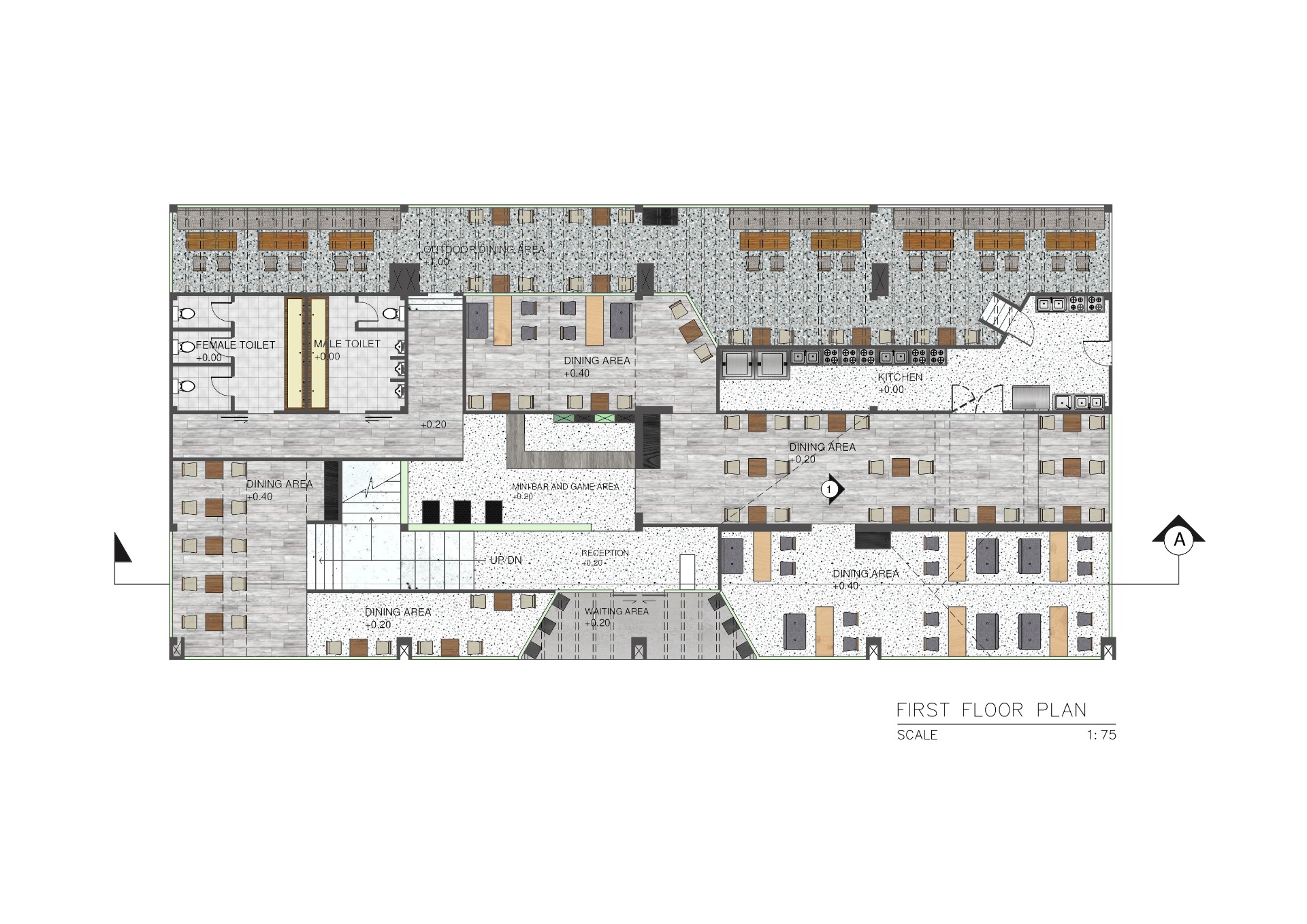 利用不同的地板材質去區分用餐區域及不同的地板高低差。