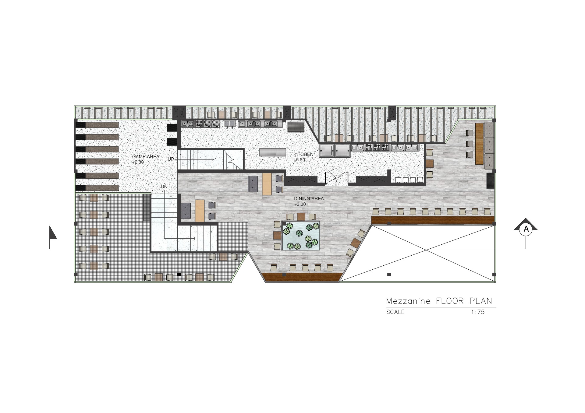 Mezzanine floor has game area for people to have fun with friends, and also has seating for single customers.