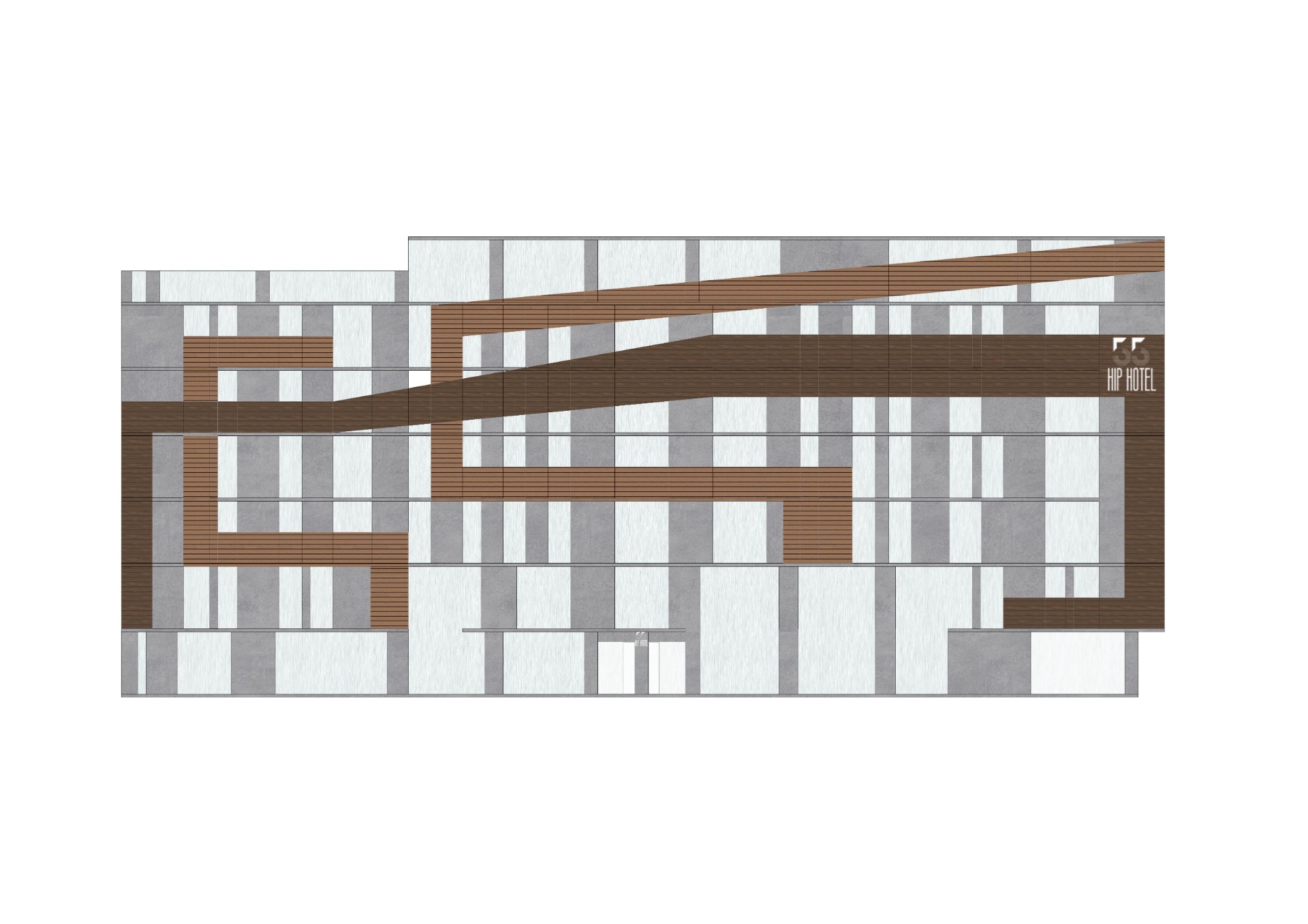 利用環塑木去設計外觀,以飯店名稱55為出發點,讓整個飯店看起來更突出。